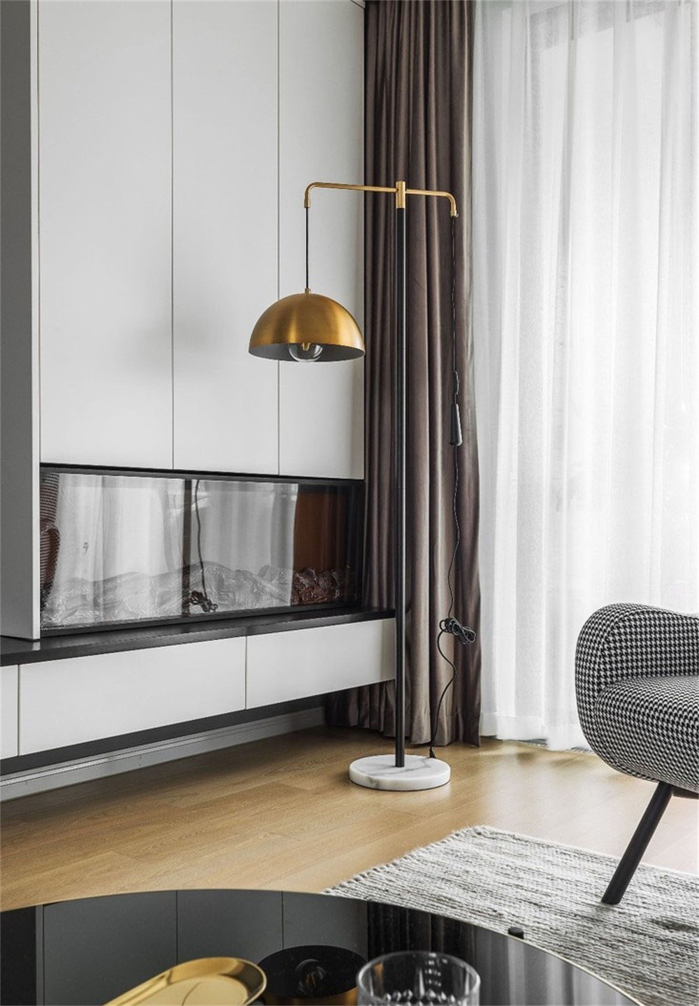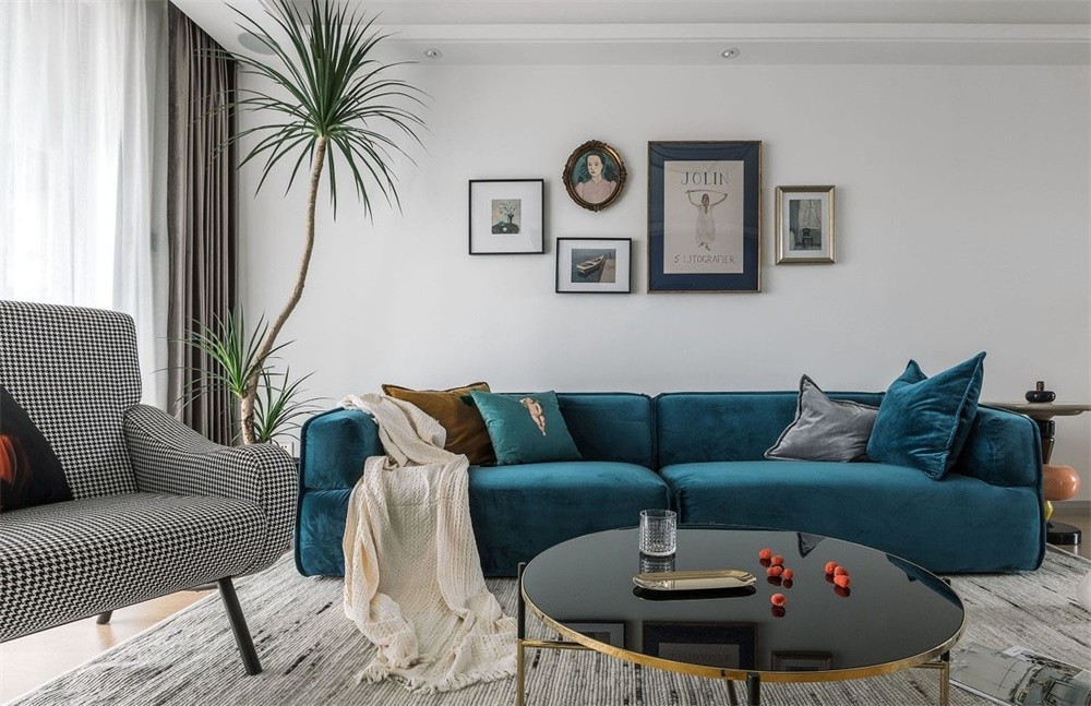 絲絨質(zhì)感的沙發(fā)搭配金屬角的玻璃茶幾,造型別致的糖葫蘆角幾、有趣的抱枕圖案、集實用與美觀于一體的電視柜有了壁爐的襯托讓客廳空間加分,營造出一個愜意輕松的生活氛圍,既混搭又精致。