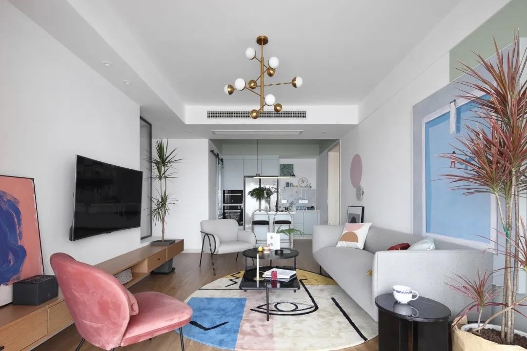 粉色休閑椅、在掛畫與地毯、綠植也是加入了粉色的元素,使得簡(jiǎn)約的空間更加浪漫雅致。頂上一盞金屬色的吊燈,則是增添了空間的華麗檔次感