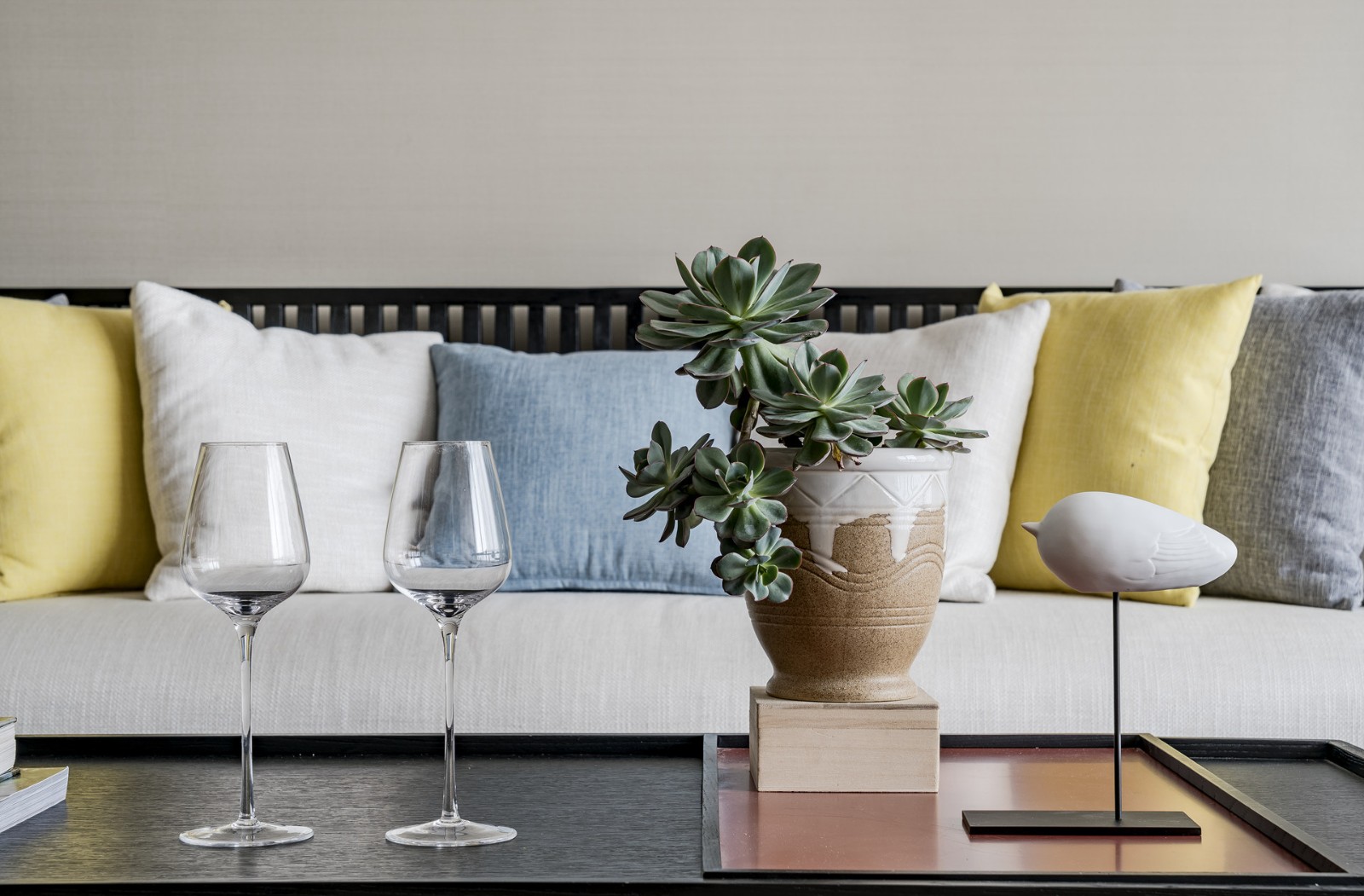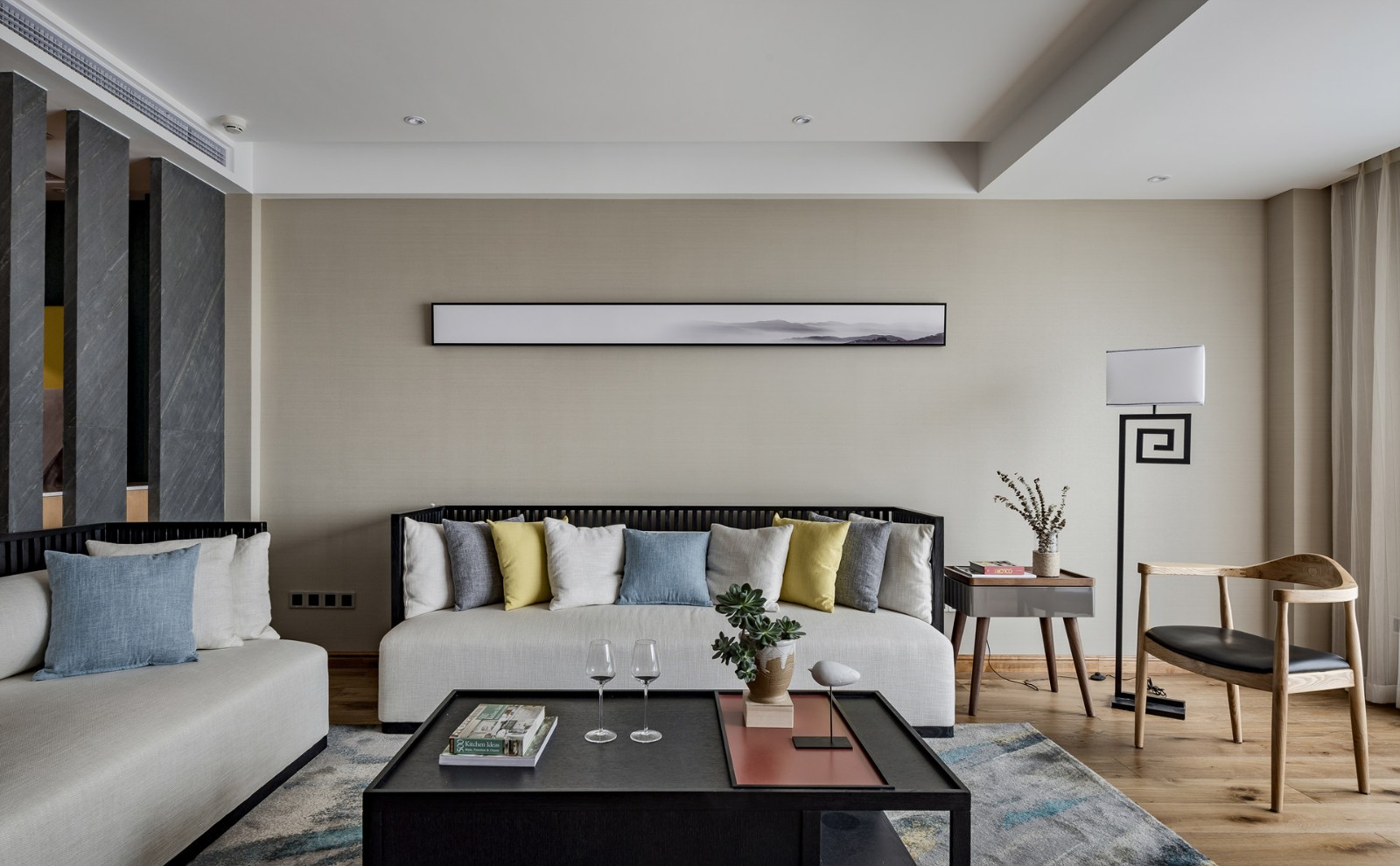 沙發(fā)背景墻珍珠白乳膠漆,新中式特有的落地?zé)簦唵蔚囊桓鄙剿畳飚嬀湍荏w現(xiàn)業(yè)主的品味。